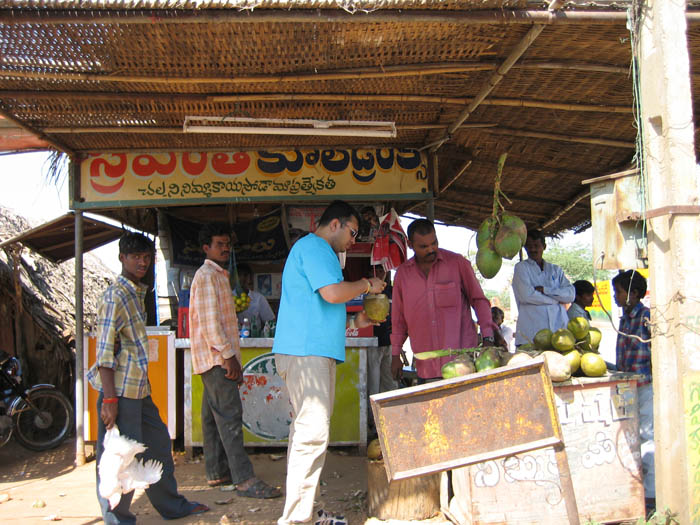 We stopped at a roadside stand for cool drinks. Ratnankur gets a few coconuts from the vendor who hacks off the top and puts in a straw.