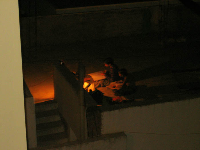Kids studying on a nearby rooftop.