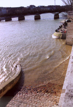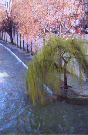 . The river was higher than usual. This waterlogged walkway normally joins the stairs where the people are sitting. I loved the willow trees, like this one that dipped into the water. . <<back